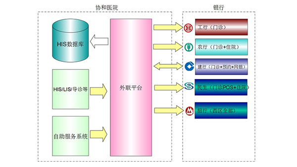 作为湖北省内营业额排名第二的超大型医院,协和医院一直是各家银行关注的热点,先后有工行、农行、建行、民生银行、招商银行五家银行参与其银医项目的建设,协和医院高瞻远瞩,为充分开展银行间的良性竞争,保障医院的业务独立性及未来的扩展性,在项目初期论证的时候就创新的提出"统一外联平台"的概念,并且选定了具有平台开发能力的武汉源启承诺建设,随后各家银行各硬件厂家都在医院和武汉源启共同制定的架构和标准下,顺利、可靠、和谐的分批建设完成,成为省内医院银医项目建设的楷模。